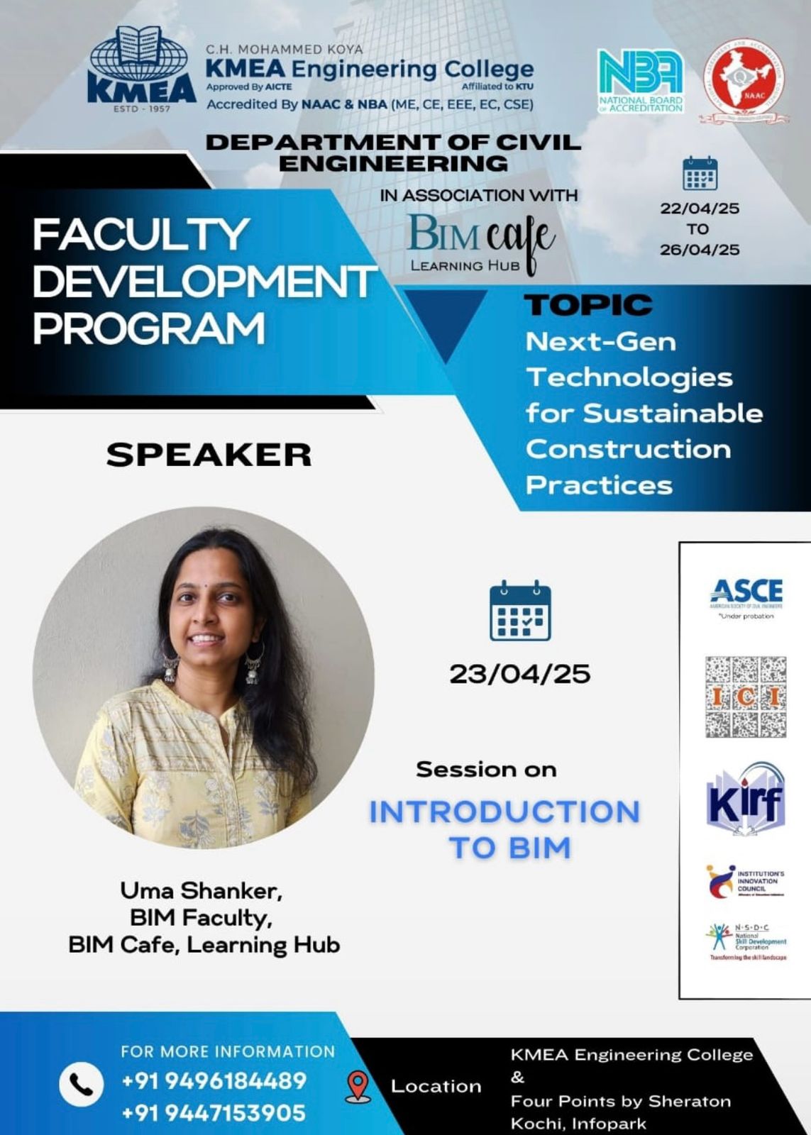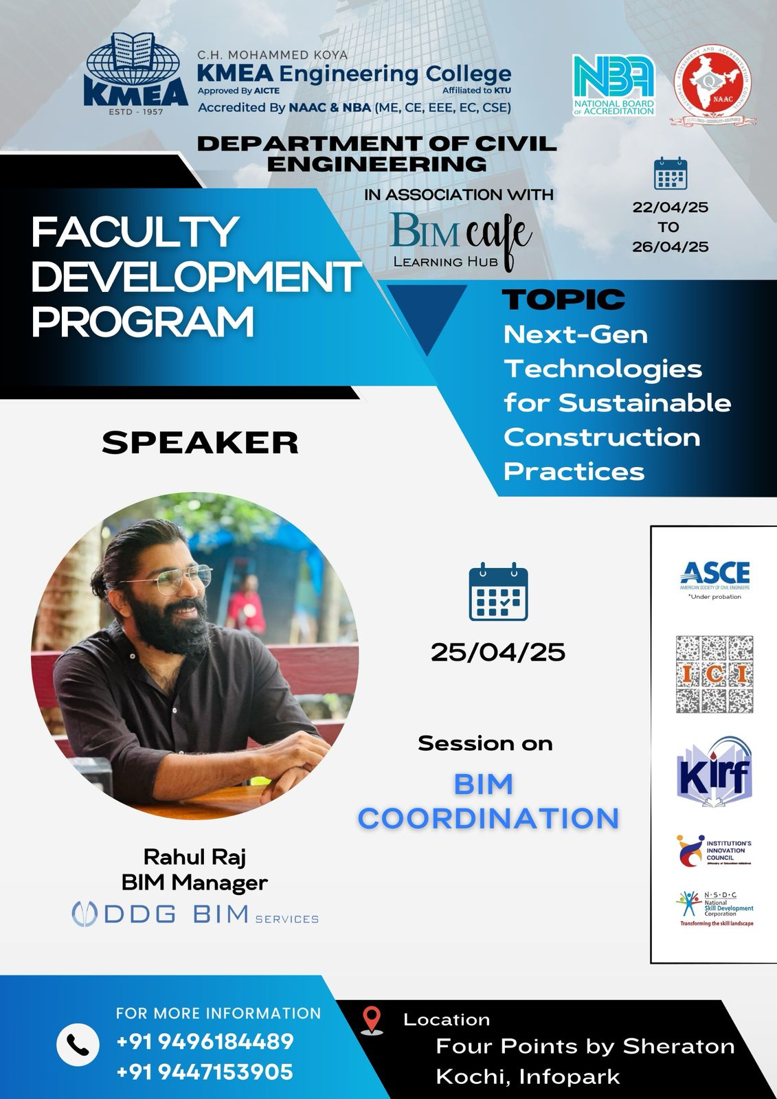 The Department of Civil Engineering at KMEA Engineering College, in association with BIM Cafe Learning Hub, successfully launched a Faculty Development Program (FDP) titled “Next-Gen Technologies for Sustainable Construction Practices.” The program, held from 22nd to 26th April 2025, was conducted at KMEA Engineering College and Four Points by Sheraton, Kochi – Infopark, gathering academic and industry experts to share insights on innovative construction technologies.
